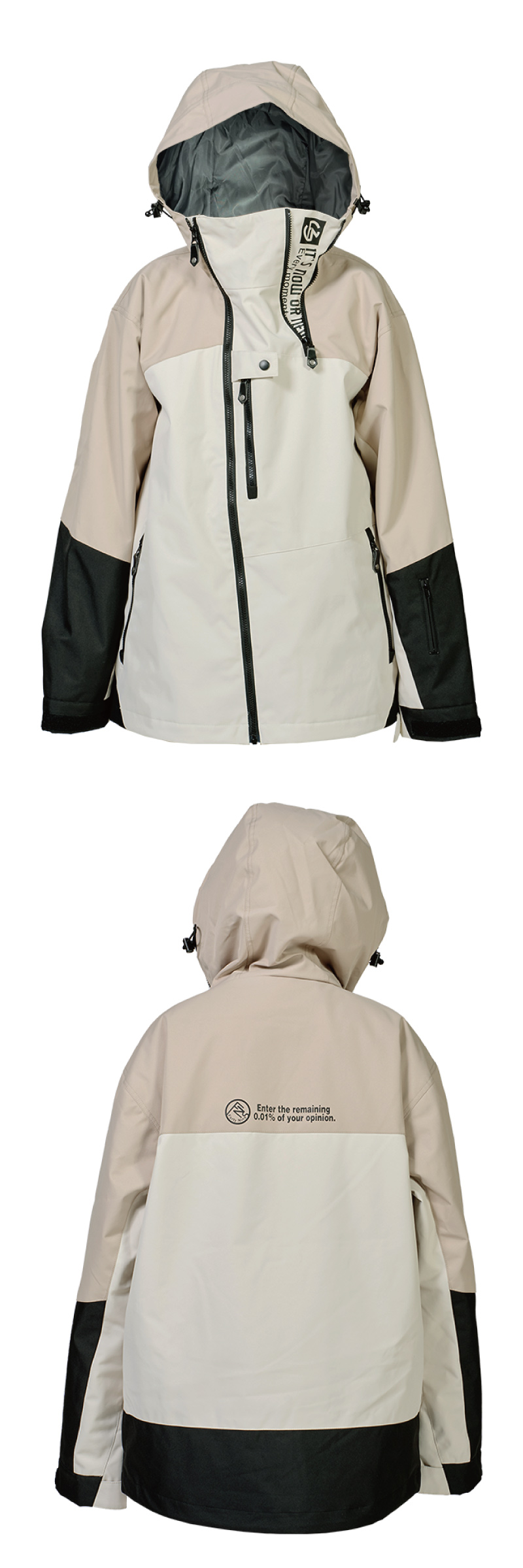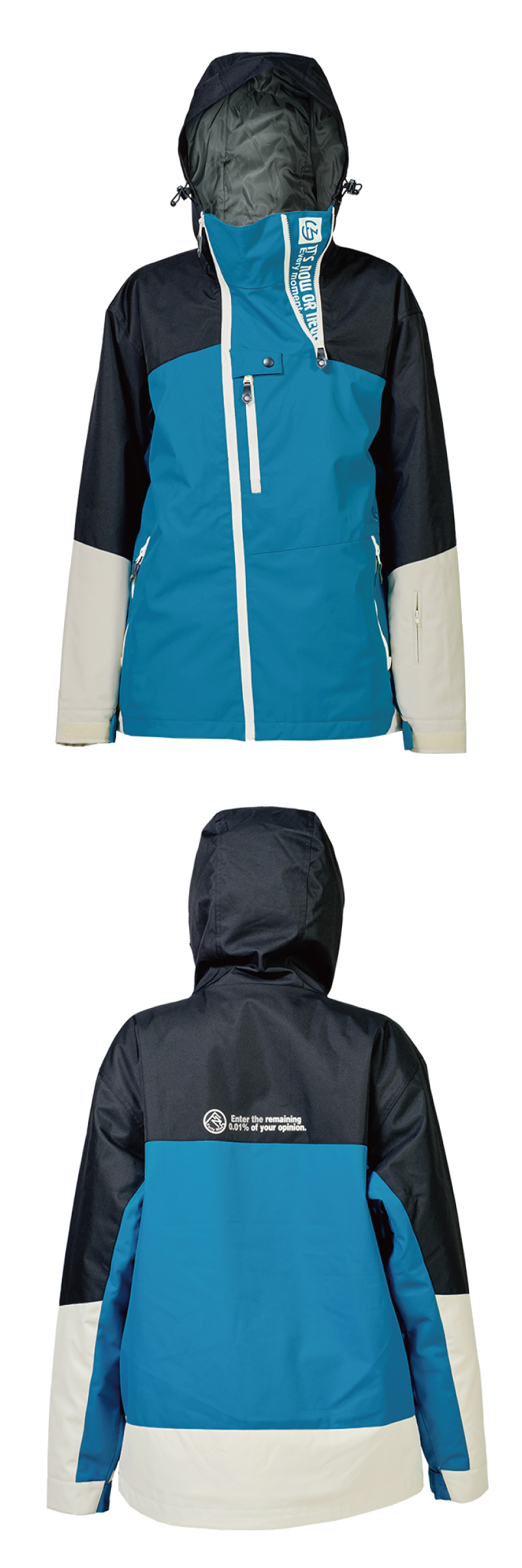 中心を外した配色のフロントジッパーと首元のプリント入りガセットがポイント。